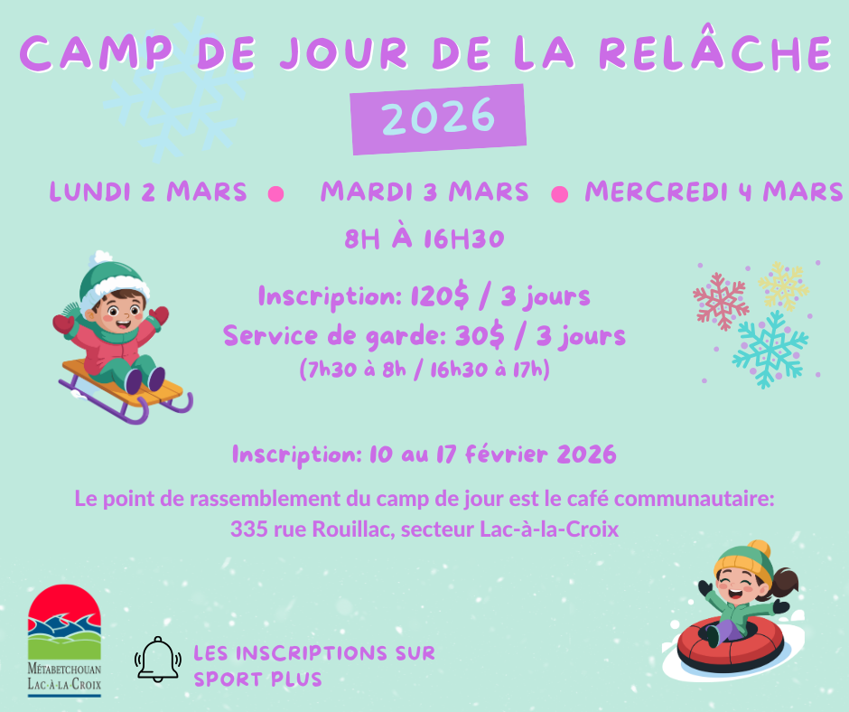 Nous offrons un camp de jour de trois jours lors de la semaine de relâche, du lundi au mercredi, avec le service de garde. Celui-ci à lieu au café communautaire, secteur Lac-à-la-Croix. Les détails pour les tarifs ainsi que les dates d’inscriptions seront mis à jour ici quelques semaines avant le début du camp.